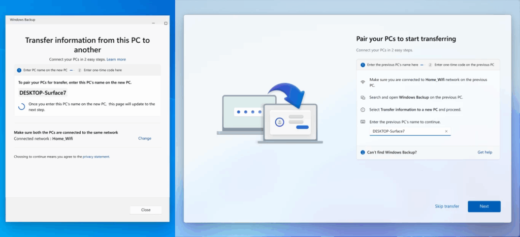 Старый и новый компьютеры должны находиться в одной сети Wi-Fi и быть привязаны к одной и той же учётной записи Microsoft. Для подключения используется одноразовый код.