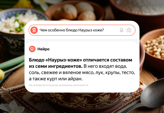 В преддверии праздника пользователи интересуются также наурыз-коже — праздничным блюдом. Его рецепты и ингредиенты — это самая популярная категория вопросов о наурыз-коже, которые задают Нейро в Поиске Яндекса. Например, пользователи спрашивают про семь ингредиентов этого блюда. Кроме того, с помощью Нейро в Поиске Яндекса люди активно ищут изображения наурыз-коже.
