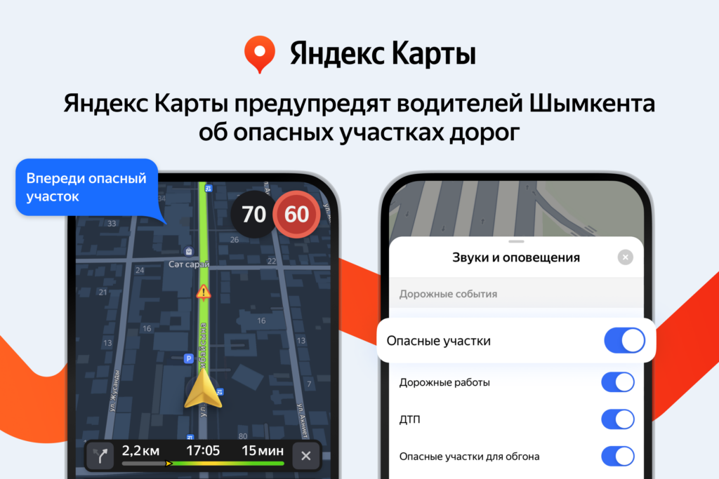 В Яндекс Картах появились голосовые оповещения об аварийно-опасных участках дорог в Шымкенте. Подсказки, доступные на казахском и русском языках, помогут водителям быть внимательнее в местах с повышенной вероятностью ДТП.