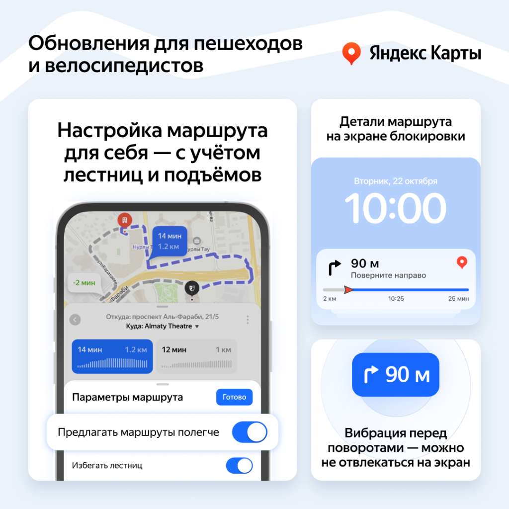 Yandex Qazaqstan обновил в Картах навигацию для пешеходов и велосипедистов. Теперь пользователи в Казахстане могут выбирать более легкие маршруты, чтобы встретить меньше лестниц и крутых подъемов на пути. За деталями маршрута можно следить даже на заблокированном экране, а вибрация перед нужным поворотом поможет меньше отвлекаться на телефон.